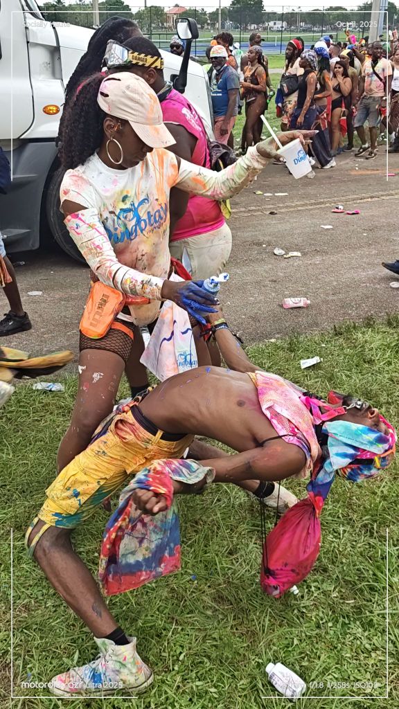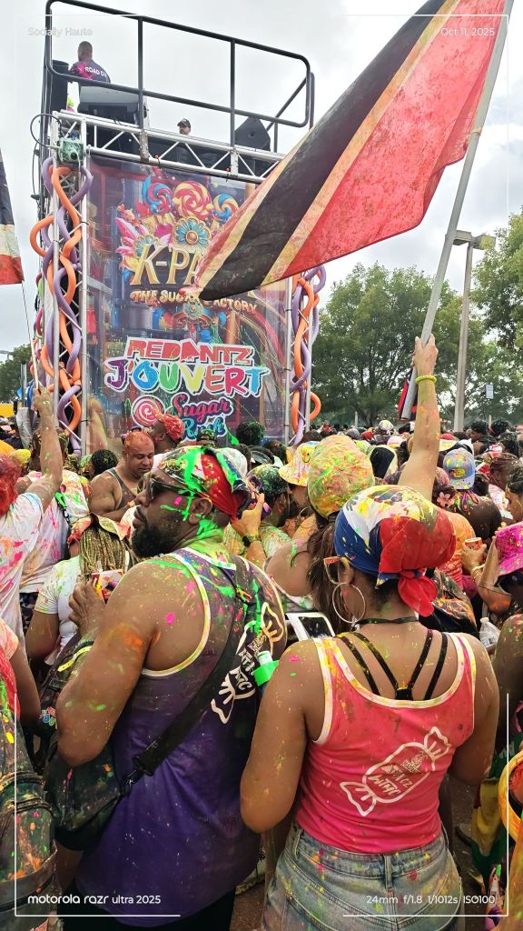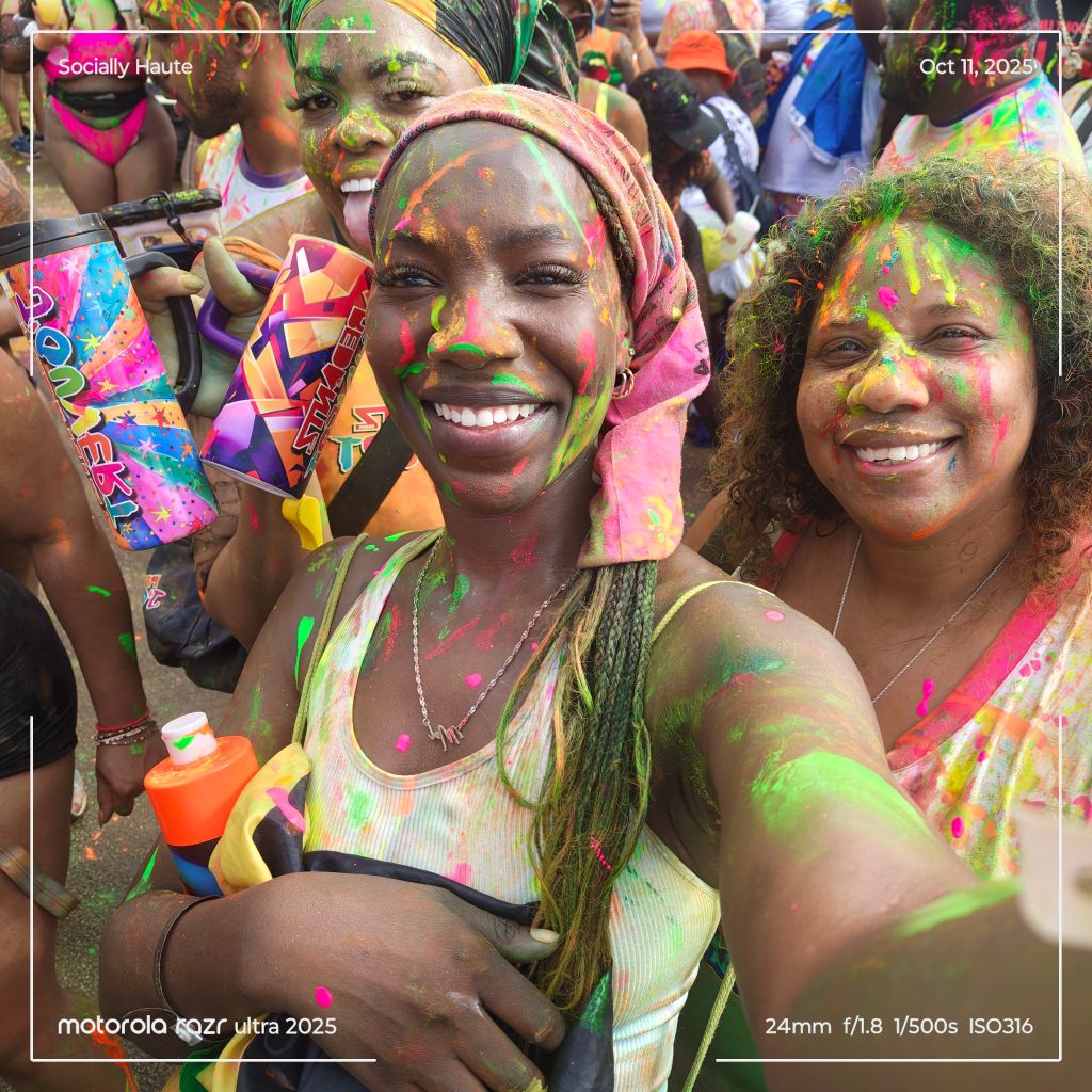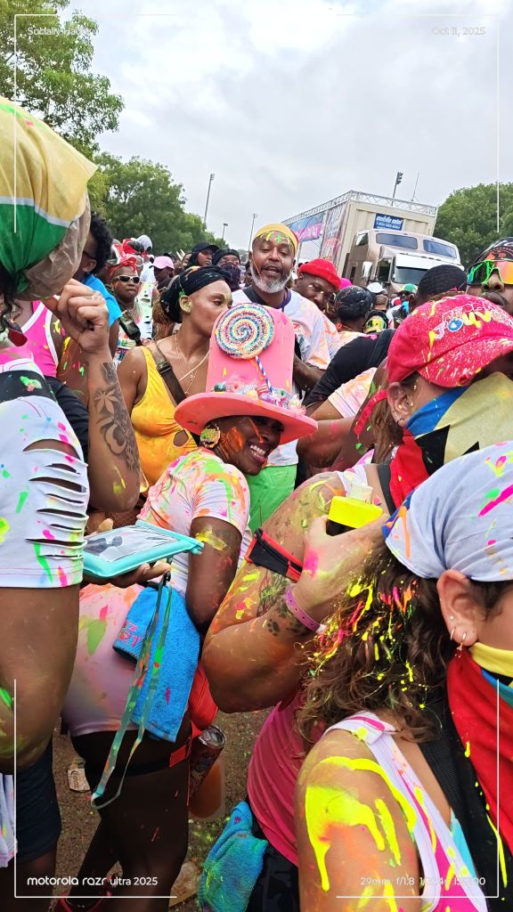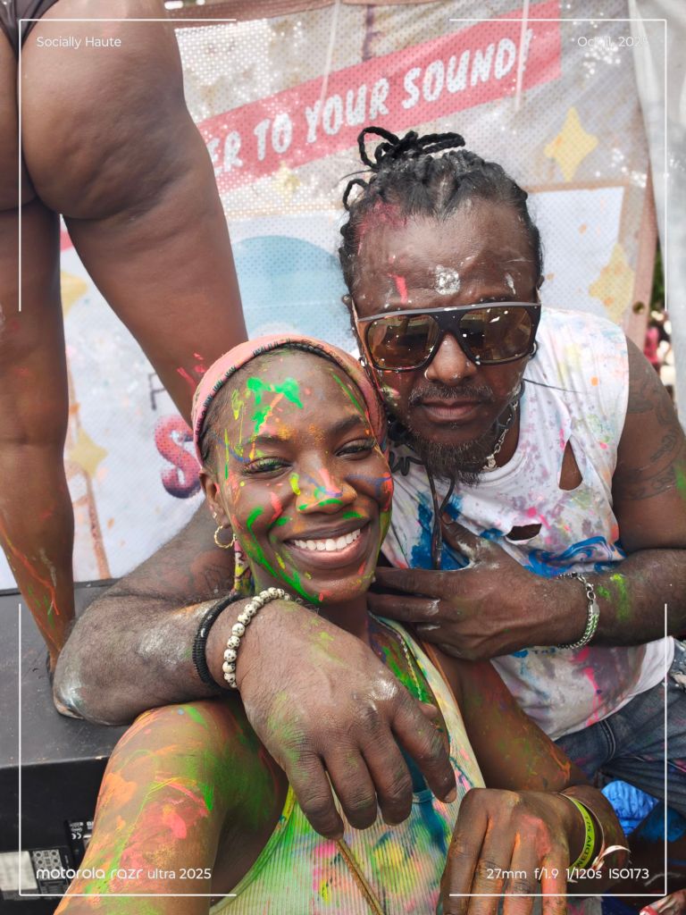 As early as 7AM, the vibes were already turned up. Paint, powder, and water filled the air as trucks rolled through, blasting Soca anthems and showering the crowd. People danced, faces smeared with colors, completely free.